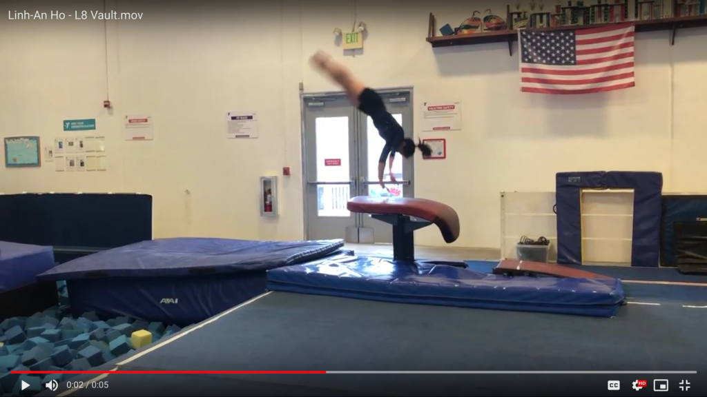 Competition Level: WAG NAIGC Level 8 Start Value: 9 Total Score: 8.25 Judge Comment: Try to squeeze legs together on entry and get a bigger block for some extra distance/height. Nice timer.